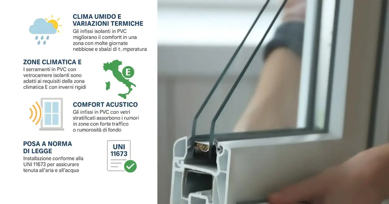 Il Comune rientra nella zona climatica E con 2.373 gradi giorno, valore che permette l’uso degli impianti termici fino a 14 ore giornaliere durante i mesi freddi; ciò implica che una buona parte dei consumi dipende dalla capacità delle finestre di trattenere il calore e di ridurre le infiltrazioni d’aria fredda, soprattutto nelle abitazioni costruite prima dei più recenti aggiornamenti normativi; i serramenti in PVC con vetrocamere ad alte prestazioni termiche permettono di mantenere più costante la temperatura interna, riducendo i cicli di accensione dell’impianto.